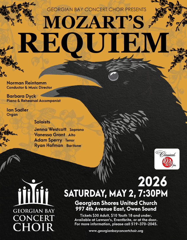 Rehearsals have begun for our concert scheduled for May 2, 2026, featuring Mozart’s Requiem interspersed with Negro Spirituals. We meet every Tuesday from 7 to 9 p.m. at the Harmony Centre in Owen Sound, starting January 6.